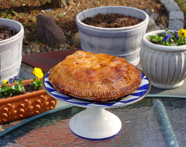To make the glaze, beat one egg yolk, 1 tsp of water and 1/4 tsp white sugar together. Brush over the top crust.