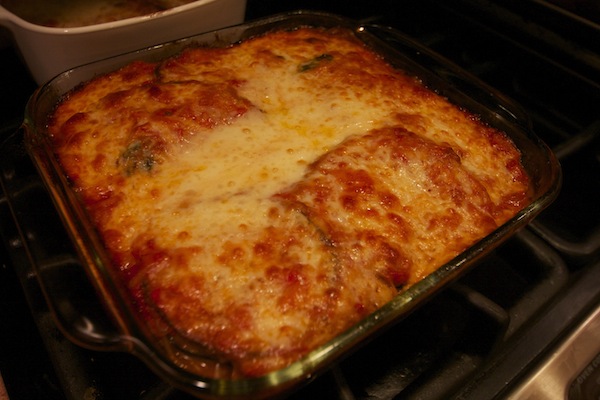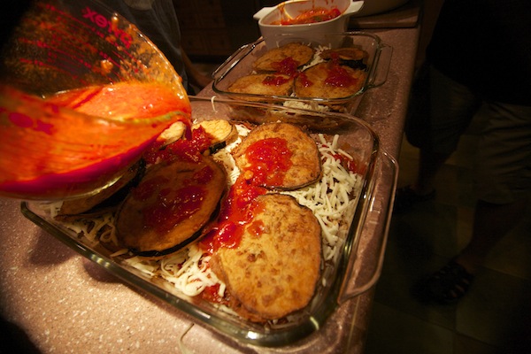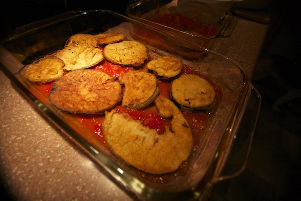 Assemble everything in a baking dish in layers. Start with a little bit of sauce on the bottom of the pan, then eggplant, mozz, parm, and a drizzle of sauce.