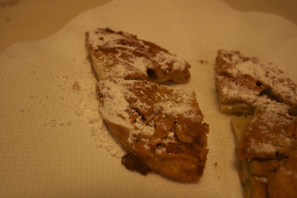 When it’s done, sprinkle a little powered sugar on top and enjoy! Besides being delicious, this snack might distract you from scarfing down tons of hot, crispy eggplant as it comes out of the pan. It also might not. I usually eat both, and chase them with large chunks of mozzarella. Extras are built into the recipe to allow for this unstoppable force.